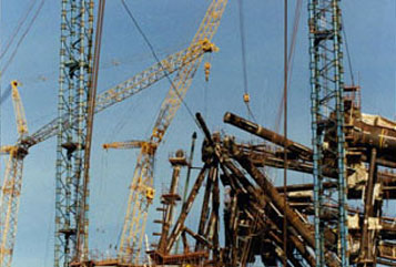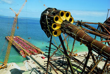 - The first use of an electromagnetic lifting and percussive tool for the installation of the vertical piles. This percussive tool was specially designed to prevent pile stick-up problems where frequency of the wave action was approaching the frequency of the pile