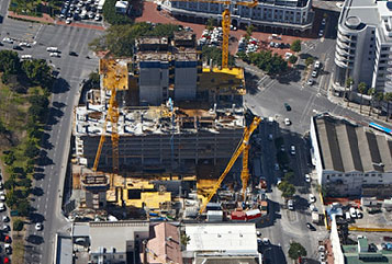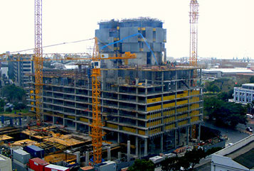 This project presented a range of construction challenges, not least of which was the logistics of erecting a massive, complex steel structure requiring 9 000 tonnes of steel produced in and transported from South Africa and lifted by three massive cranes. The atrium is 180 metres high, one of the tallest in the world. A 24 metre wide helipad projects from the building 210 meters above the ground.